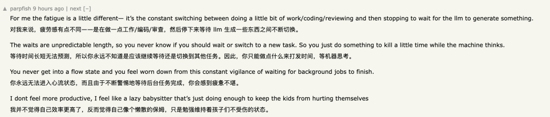 再比如说写代码,AI看似节省了大把时间,但实则要求他进行逐行审核,编程以外的工作陡然加倍。