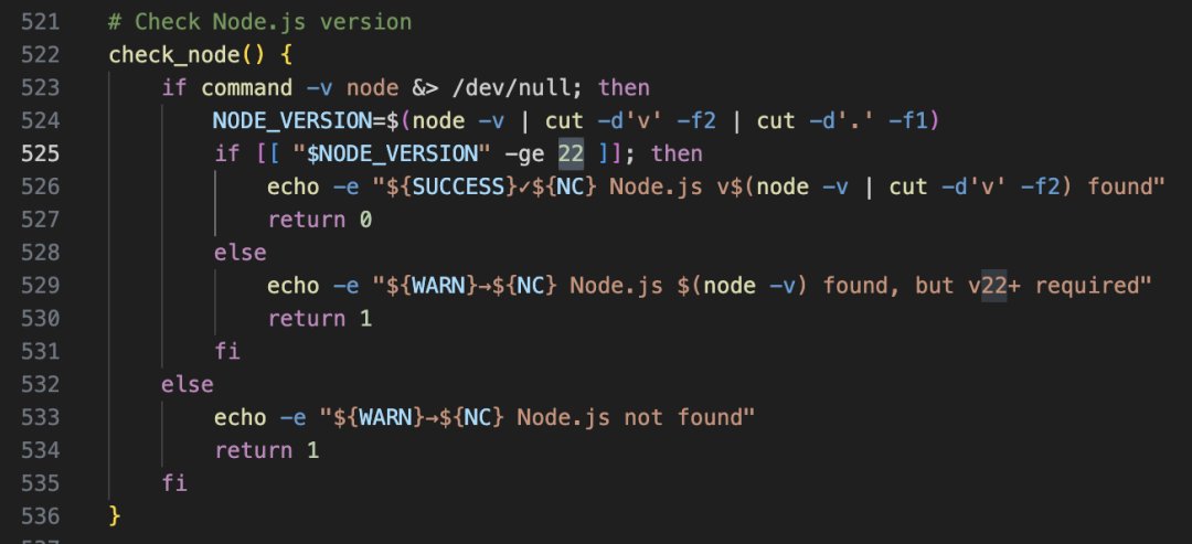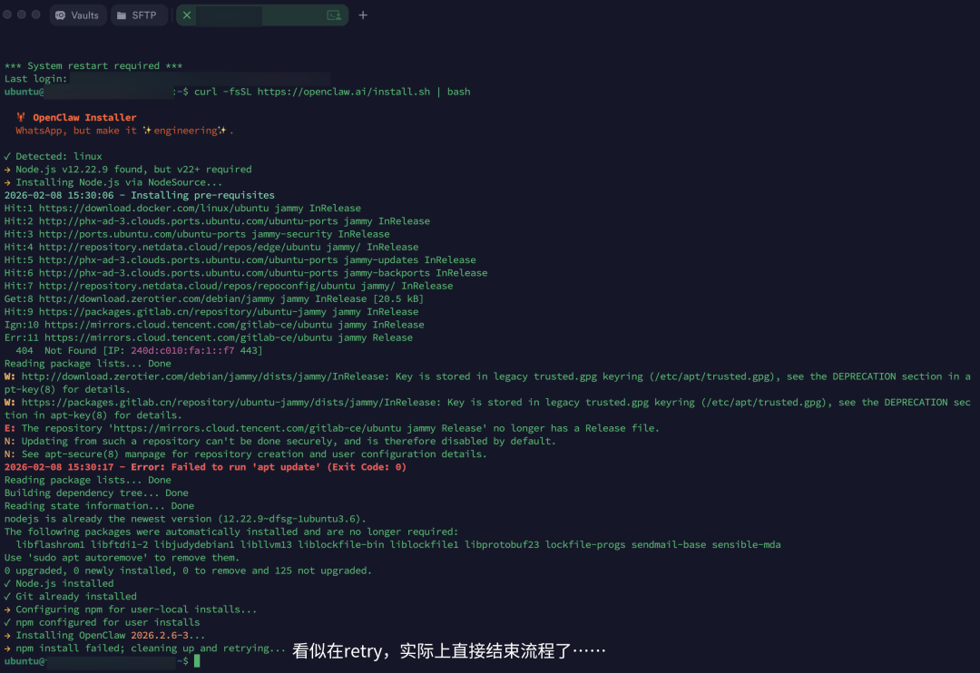 首先是版本强校验,脚本里白纸黑字写着需要Node.js 22+,但现在很多云厂商提供的Ubuntu或CentOS默认镜像,自带的Node版本往往还停留在v18甚至更低,脚本跑一半就会直接报错,逼着你去手动升级系统环境。