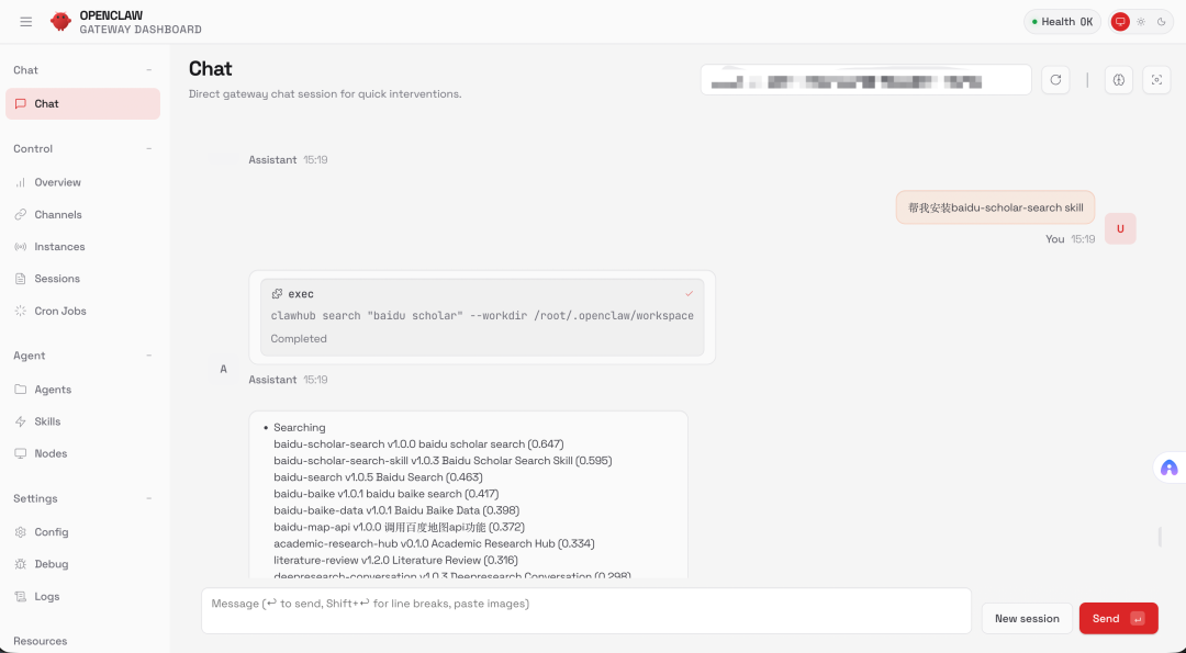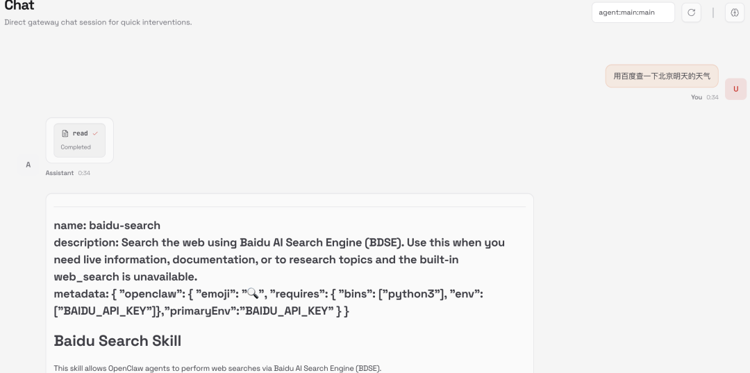 安装了百度搜索(Baidu Web Search)和百度百科(Baidu Baike Search)这两个Skills后,OpenClaw就具备了不用模拟浏览器就能实现的信息检索能力。