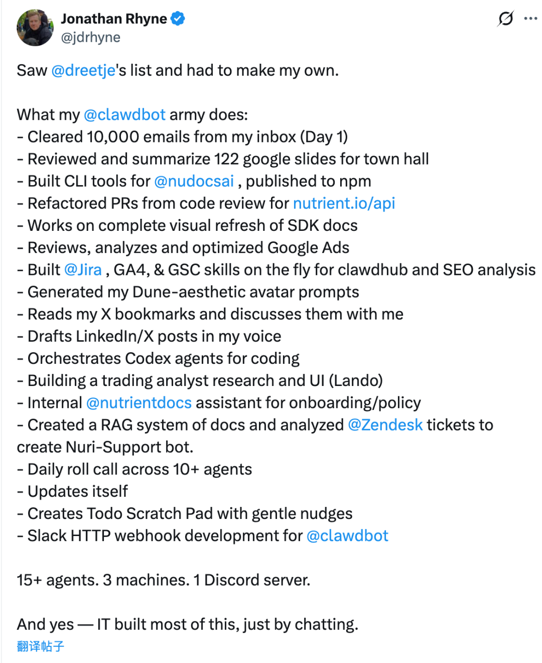 比如这位网友就用三台电脑、15个Agent部署了自己的“数字军团”,他只需要在一个Discord频道里坐镇指挥,就能让它们完成处理邮件、读PPT、写代码、发推文,甚至撰写每日汇报等一系列工作。