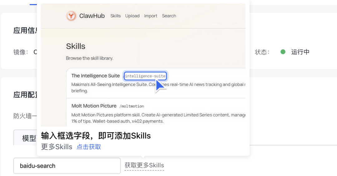 如果你通过百度智能云来部署,这6个Skills可以直接在后台添加,其他部署方式的话,也只要在终端里敲一行npx clawhub@latest install加上技能包的名字,就能把这些百度官方维护的稳定能力装进去。