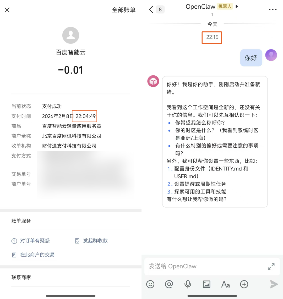 毫不夸张,这次我特意盯着表,从购买实例到通过飞书跟我的Agent说上第一句话,全程只用了十分钟。