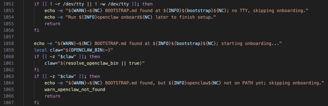 其次是交互限制,脚本里写了大量的TTY检测逻辑。这意味着如果你想省事,在某些云平台的Web Shell或者自动化脚本里运行,它会因为检测不到“人机交互界面”而直接跳过引导流程,留给你一个没配好的半成品。