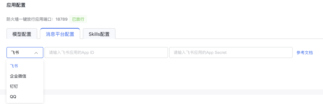 只需要在消息平台配置菜单里选择相应的平台,然后对照后面链接的参考文档按图索骥,就能完成配置。