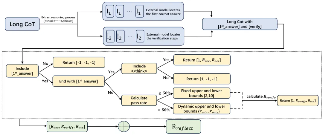 为此,团队引入了三个维度的奖励:首次正确答案、最终正确性,以及反思步骤数量是否落在合理区间内。