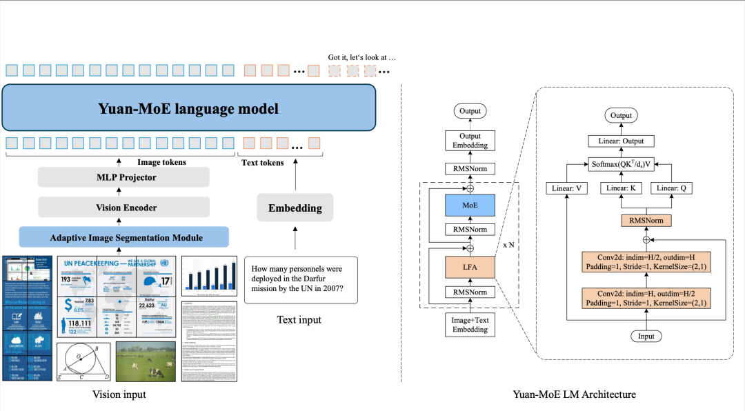 视觉编码器处理高分辨率图像,通过自适应分割机制将图片拆分成高效token,避免显存爆炸;语言主干网络采用Local Filtered Attention(LFA),进一步降低计算开销。