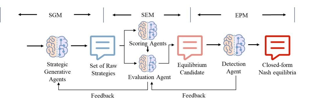 现有的求解方法各有局限性:解析法依赖于不动点定理,虽然精确但难以扩展至高维或复杂动态场景;数值方法(如蒙特卡洛模拟)虽然灵活,但往往缺乏严谨的收敛保证,且其结果如同「黑盒」般难以解释;而基于机器学习的方法(如强化学习)虽擅长处理高维问题,却常受困于参数敏感性与泛化能力的不足。因此,学术界与工业界亟需一种兼具可扩展性、透明度与数学严谨性的全新计算范式。随着大语言模型的崛起,其强大的逻辑推理与代码生成能力为自动化博弈分析开启了新纪元。