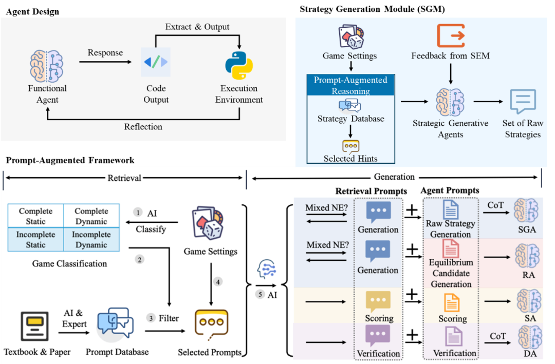 为了提升生成质量,PrimeNash引入了提示增强推理技术。系统会自动从预设数据库中检索相似博弈的解题模版(如博弈论中的相关定理、最佳响应函数等),辅助智能体更好地理解博弈结构。