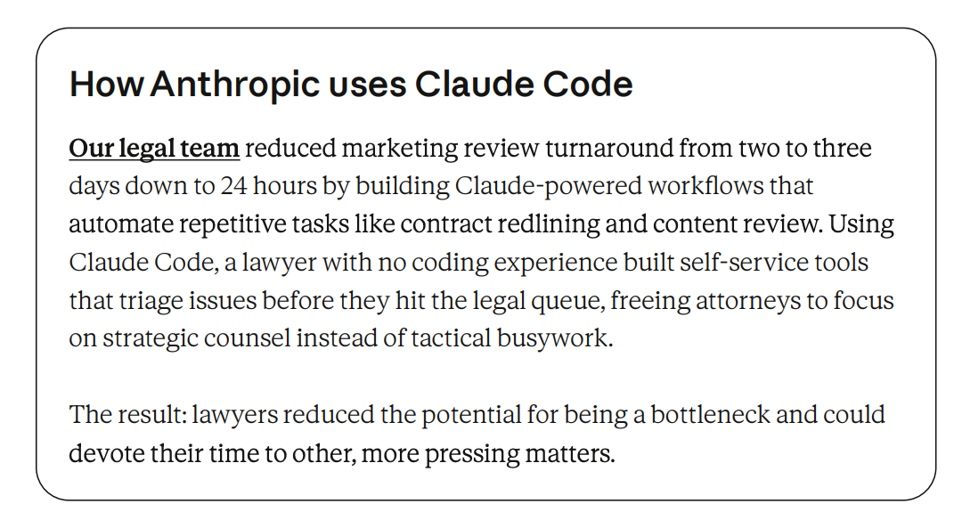 法务团队用Claude驱动的工作流,把营销审核周转时间从2-3天缩短到24小时。一位没有编程经验的律师用Claude Code构建了自助服务工具,在问题进入法务队列之前就进行分类处理,释放律师的时间去做战略性法律咨询,而非战术性的琐碎工作。