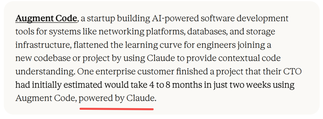 Augment Code(一家AI开发工具初创公司)的企业客户,用Claude完成了一个项目,他们的CTO原本估计需要4到8个月。最终,只花了两周。