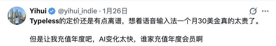 200多块钱每个月,订阅价格直接压过ChatGPT Plus,功能却单一到离谱:只做语音输入一件事。