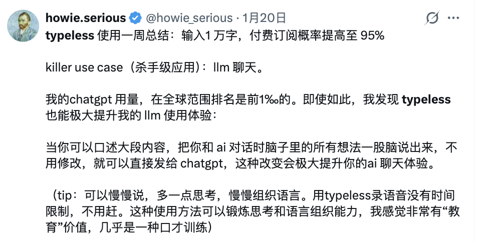 还有网友通过Typeless来跟ChatGPT聊天,并感觉这样口述的方式反而能极大提升他的AI使用体验,也是一种口语练习方式(我咋没想到):