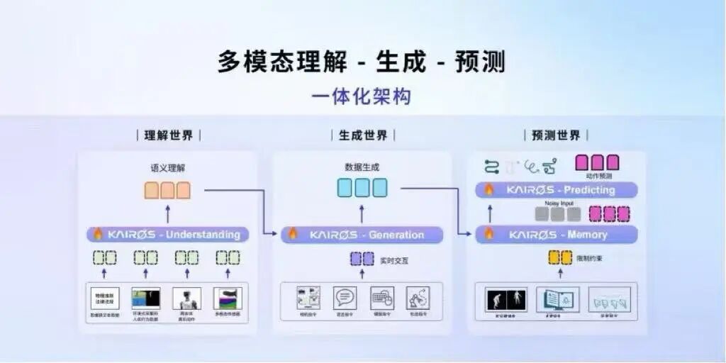 该模型试图构建一个跨机器人本体的统一世界理解框架,将物理规律、人类行为模式与真实机器动作纳入同一体系,使系统具备对复杂物理世界因果关系的理解能力,同时能够生成长时、动态的交互场景,并对未来状态进行预测。