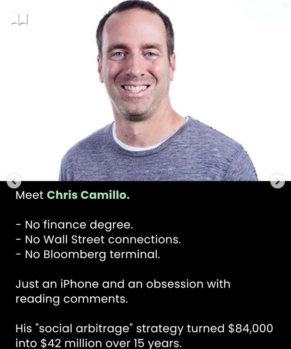 2007年,Chris Camillo——一个没背景、没终端、没华尔街人脉的普通人,靠的不是Bloomberg,而是眼睛,实现了财富暴增。