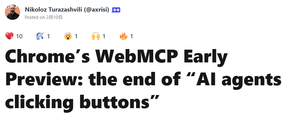开发者大佬Nikoloz Turazashvili最新一文,深度解释了WebMCP的出现对于开发意味着什么。