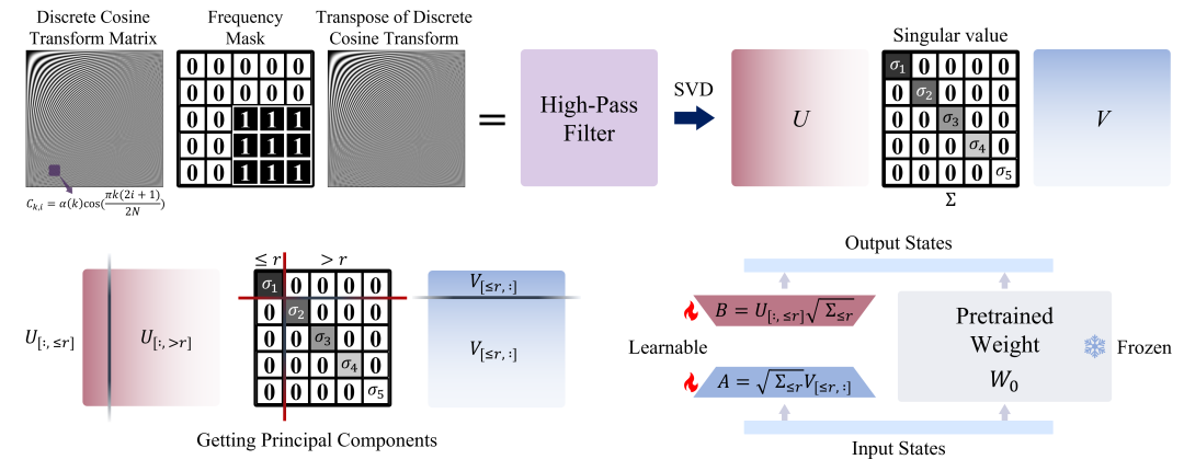 具体而言,HiFi-LoRA首先利用二维离散余弦变换(DCT)在频域构建了一个理想的高通滤波器,该滤波器能够精确提取图像中的高频边缘信息。随后,通过奇异值分解(SVD)技术提取该滤波器权重矩阵中能量最集中的主成分,将其最优低秩近似作为LoRA适应矩阵的初始化参数。
