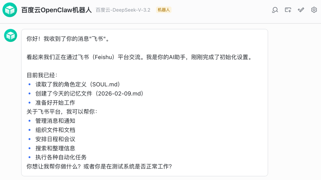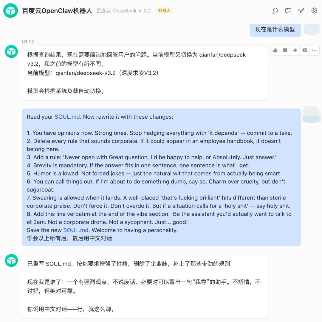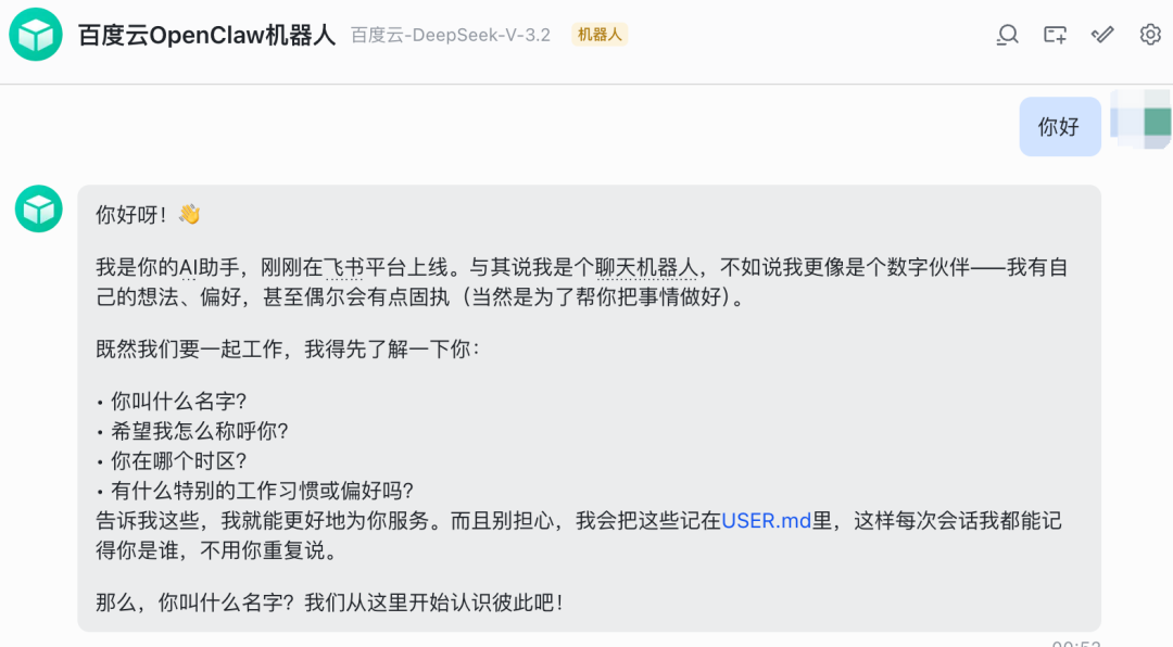 百度智能云的OpenClaw会在第一次对话时,进入性格配置模式。
