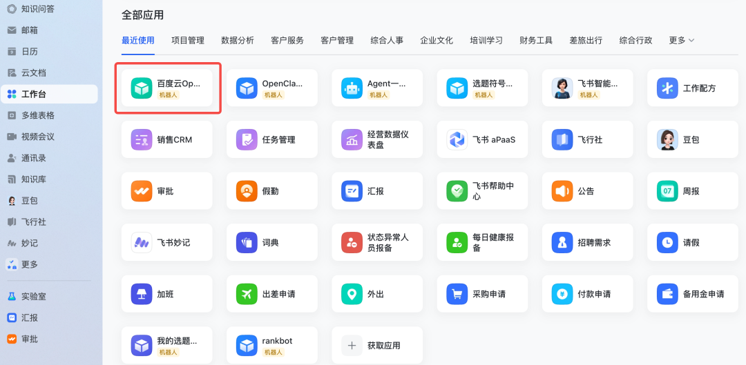 在飞书工作台的最近使用中,选择最新添加的机器人。