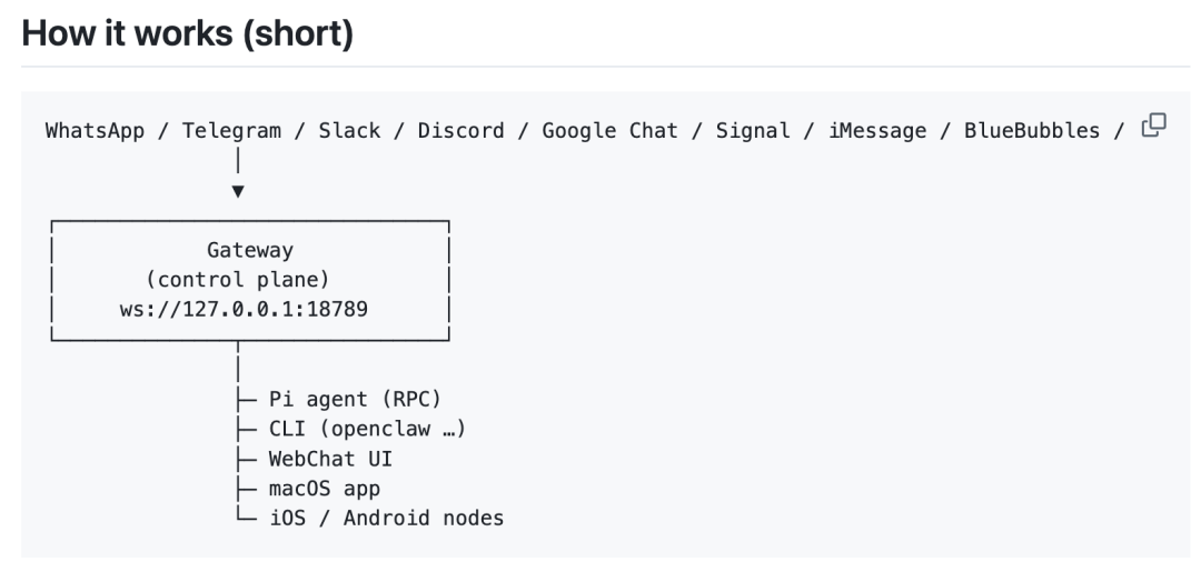 OpenClaw底层的运行逻辑非常直观,来自各平台的指令,通过「网关」(Gateway)分发给LLM(任何模型API),然后在电脑上执行具体命令。
