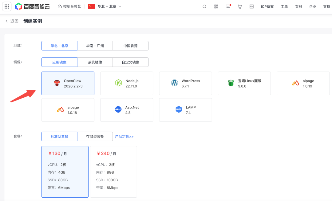 第一步,创建一个实例,百度智能云已经在镜像中内置好了OpenClaw。
