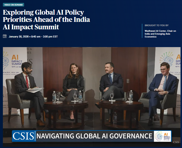 CSIS(战略与国际问题研究中心)瓦德瓦尼人工智能中心与“印度与新兴亚洲经济讲席”于2026年1月30日联合举办“印度人工智能影响峰会前瞻:探讨全球人工智能政策重点”。本次会议汇聚人工智能领域的重要声音,围绕印度在即将到来的峰会中的目标,以及专家对全球人工智能政策未来走向的判断展开交流。