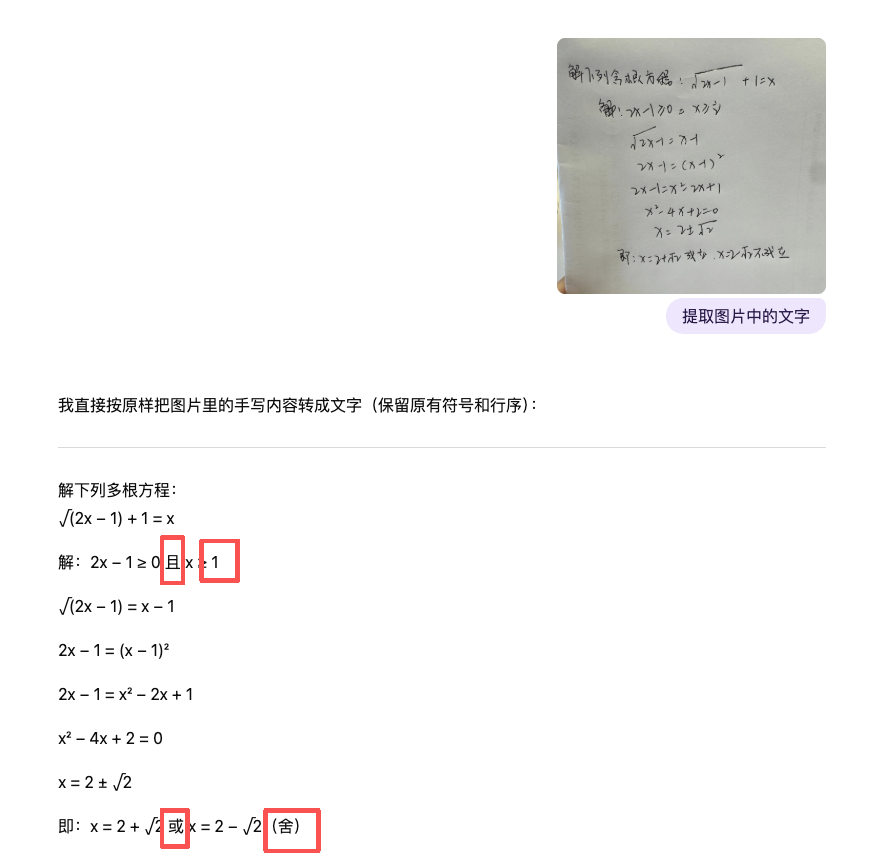 不难看出,图片中一共出现了3处解析错误, 当笔画写得比较潦草时,模型把X识别成了=,把成立识别成了或,另外不知道为啥还凭白无故多出来了一行公式……