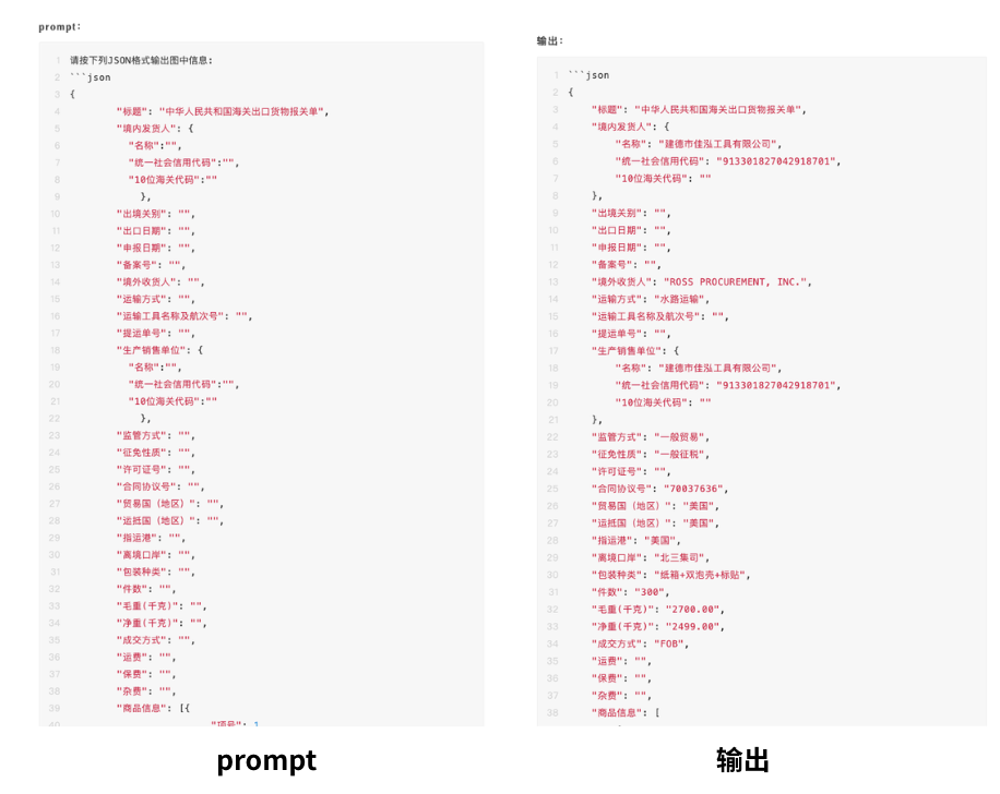 在输入对应的提示词后,模型会根据指令要求,从表格中定向抽取指定字段,并将结果整理成结构清晰、字段明确的JSON输出: