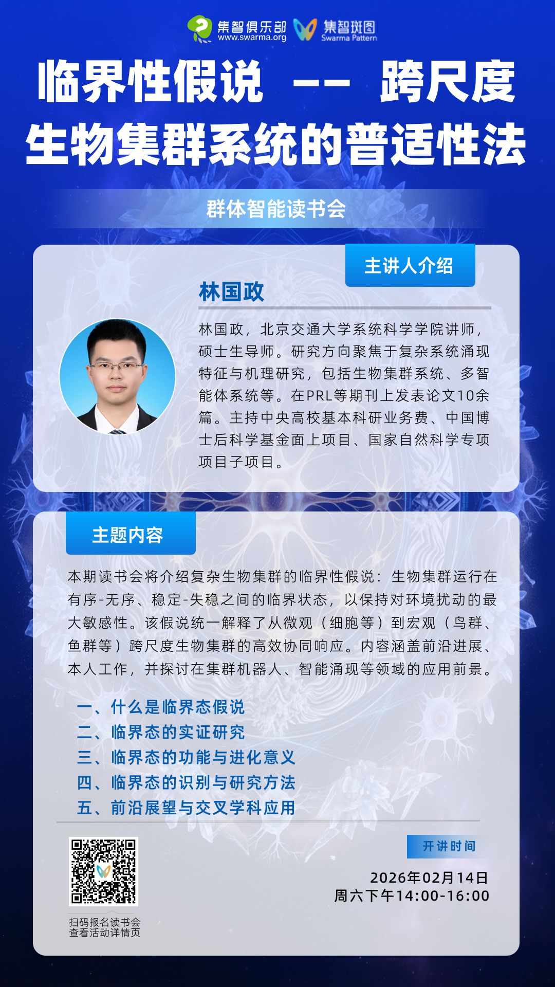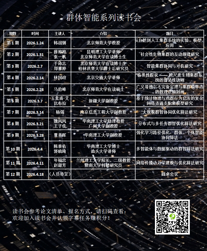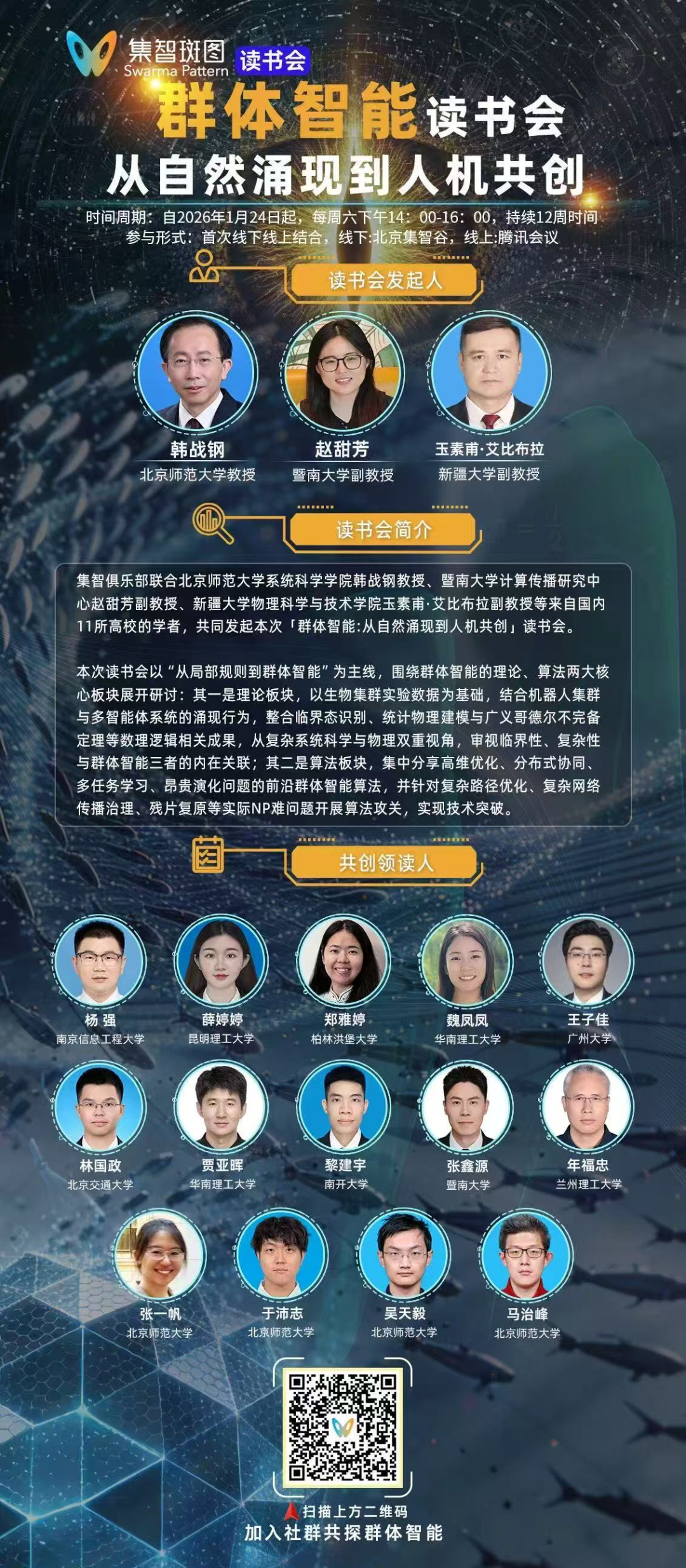 2026年2月14日(周六)下午14:00-16:00,腾讯会议线上进行,微信视频号+集智俱乐部B站号同步直播,感兴趣的朋友扫码报名加入群体智能读书会后,可进入学员群进行交流。