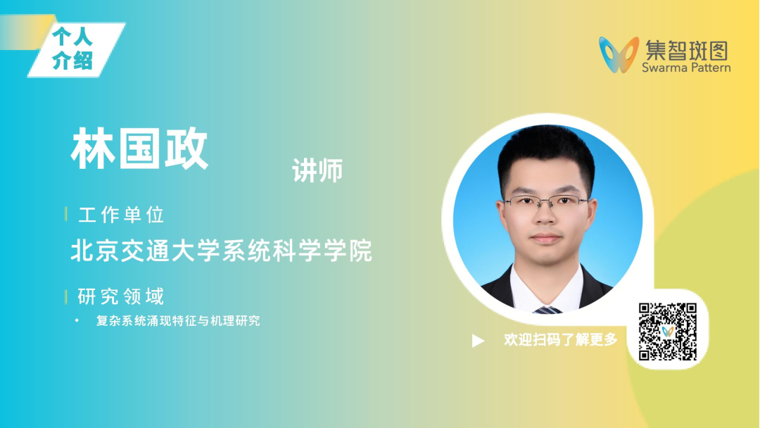 主讲人:林国政,北京交通大学系统科学学院讲师,硕士生导师,2024年毕业于北京师范大学系统科学学院。主要从事各类复杂系统涌现特征与机理的研究,包括鱼群、蚁群生物集群系统、多智能体系统、交通系统等。在Physical Review Letters、PRX Life、PLoS Computational Biology等期刊上发表论文10余篇,主持中央高校基本科研业务费、中国博士后科学基金面上项目、国家自然科学专项项目子项目。