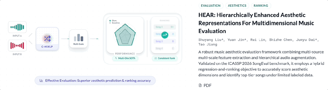 在声学与音频领域的国际顶会ICASSP 2026上,首届“歌曲美学自动评估挑战赛”结果揭晓,自由量级打造的AI音乐评价系统(BAL-RAE),在全球多支研究团队的激烈竞争中表现突出,斩获Task 1(歌曲综合美学评分)全球第二名。