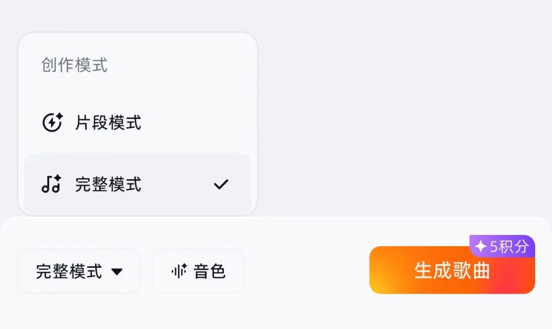 “片段模式”专为短视频、社交媒体分享等短内容场景设计,直接生成结构紧凑、高潮突出的精华段落。 “完整模式”可生成2-6分钟的成熟作品,涵盖主歌、副歌、间奏等完整结构,更适合个人作品或深度表达。