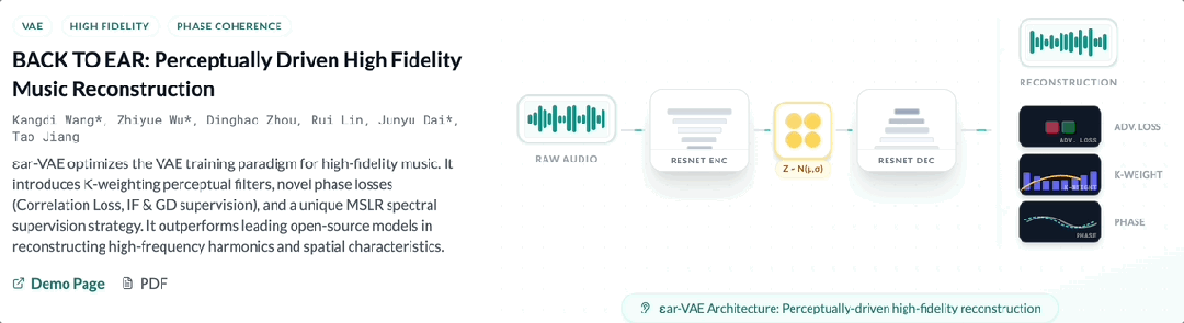 与此同时,声音的“物理质感”被重新打磨。音潮V3.0采用团队自研ϵar-VAE[3]核心技术对空间信息进行独立建模,并将这套高保真重建方案应用到整体生成链路中。