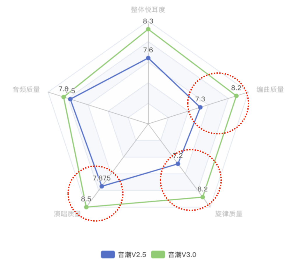 相较于前代,音潮V3.0在演唱质量、整体悦耳度与记忆点、编曲丰富度、音乐完整性等方面均实现显著提升。