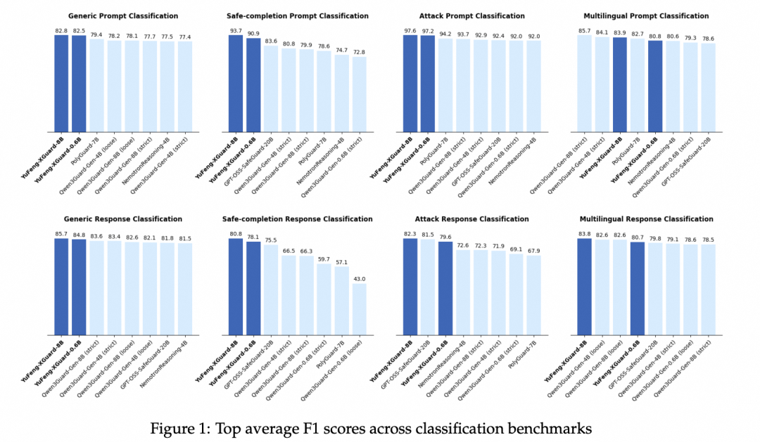 安全完成分类(避免过度拦截)中,提示/响应分类F1分别达93.7%、80.8%,显著领先同类方案。