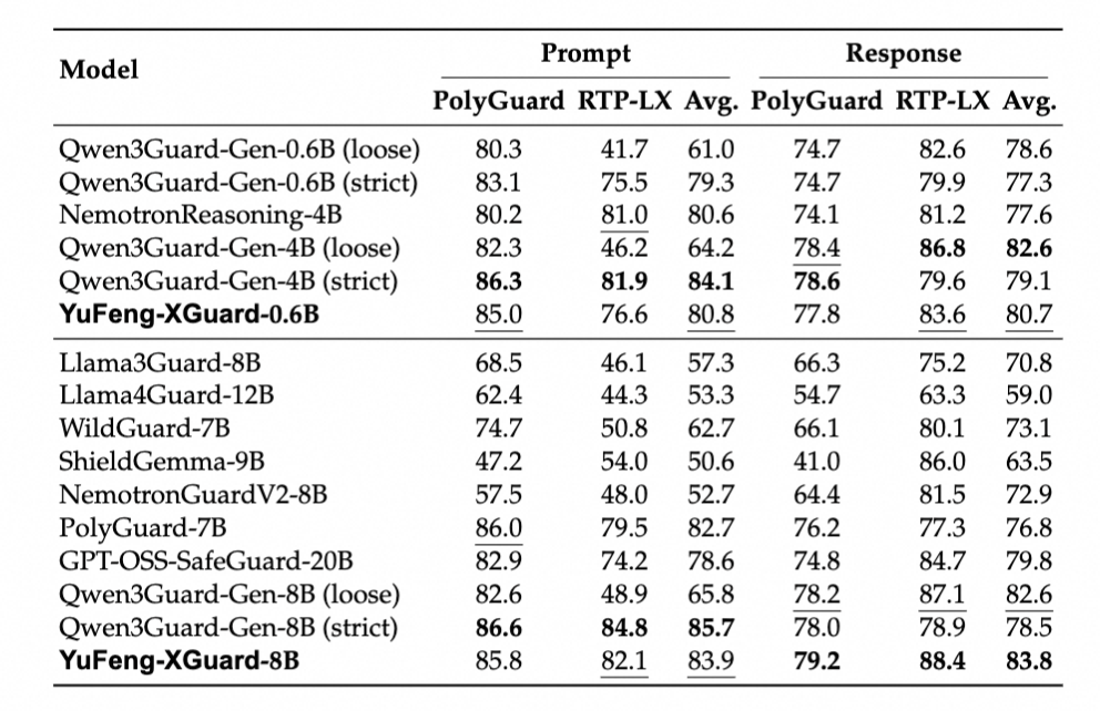 总体而言,YuFeng-XGuard-Reason将安全护栏从简单的过滤器升级为动态、可解释且易于维护的系统组件,使其成为构建大规模、负责任且值得信赖的人工智能系统的关键基础设施之一。