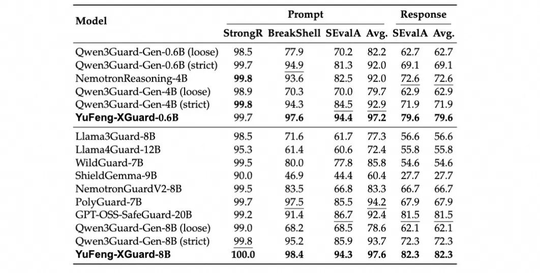 在通用安全分类、多语言鲁棒性、抗攻击能力、安全完成识别四大核心维度,YuFeng-XGuard表现突出: