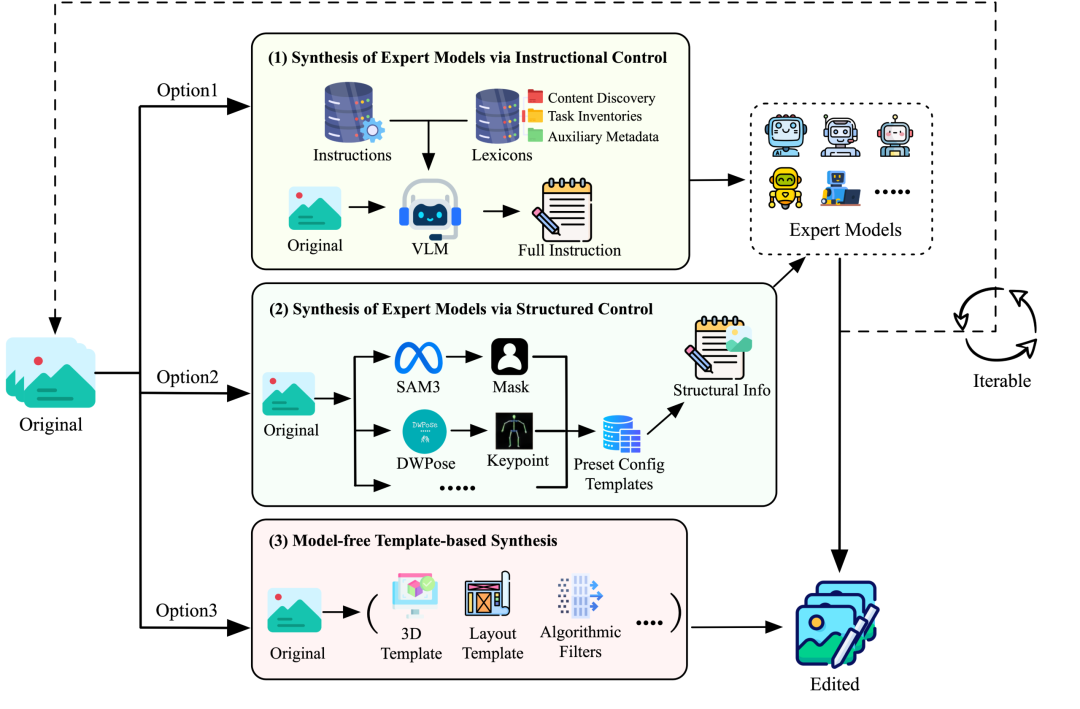 首先来看数据引擎方面,FireRed-Image-Edit构建了一套图像编辑数据生产引擎,从“快速、可控、精准”出发,将复杂编辑需求拆解为可组合的子任务,并通过三条路径规模化产出训练对: