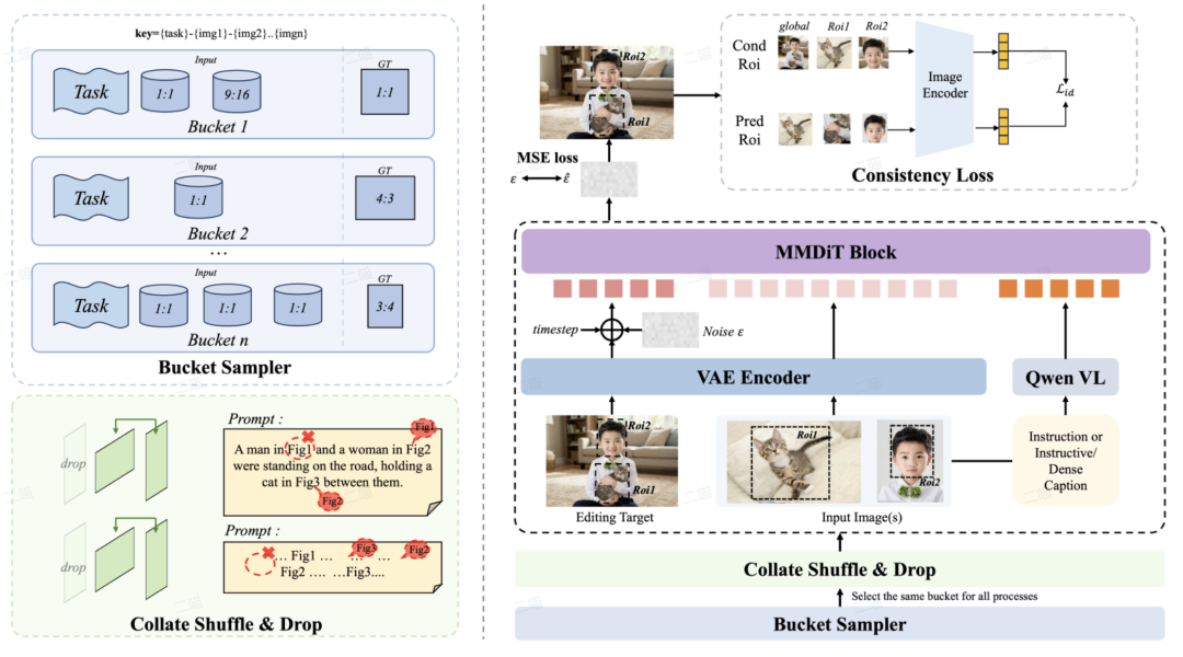 预训练阶段:通过多条件感知桶采样来平衡不同的编辑任务,并通过随机动态指令来提升模型的指令泛化理解能力,并通过前置的embedding抽取来提升训练效率;