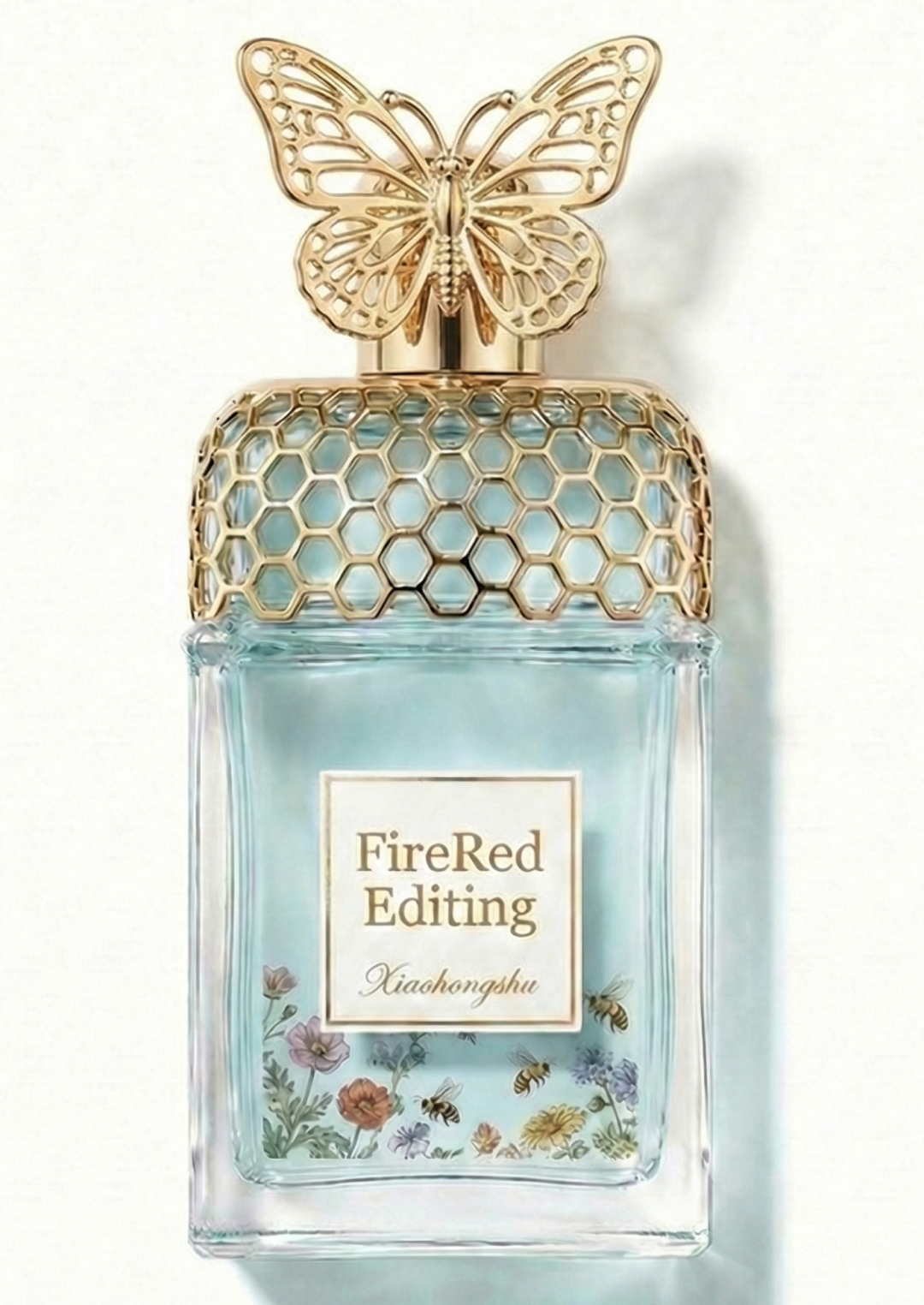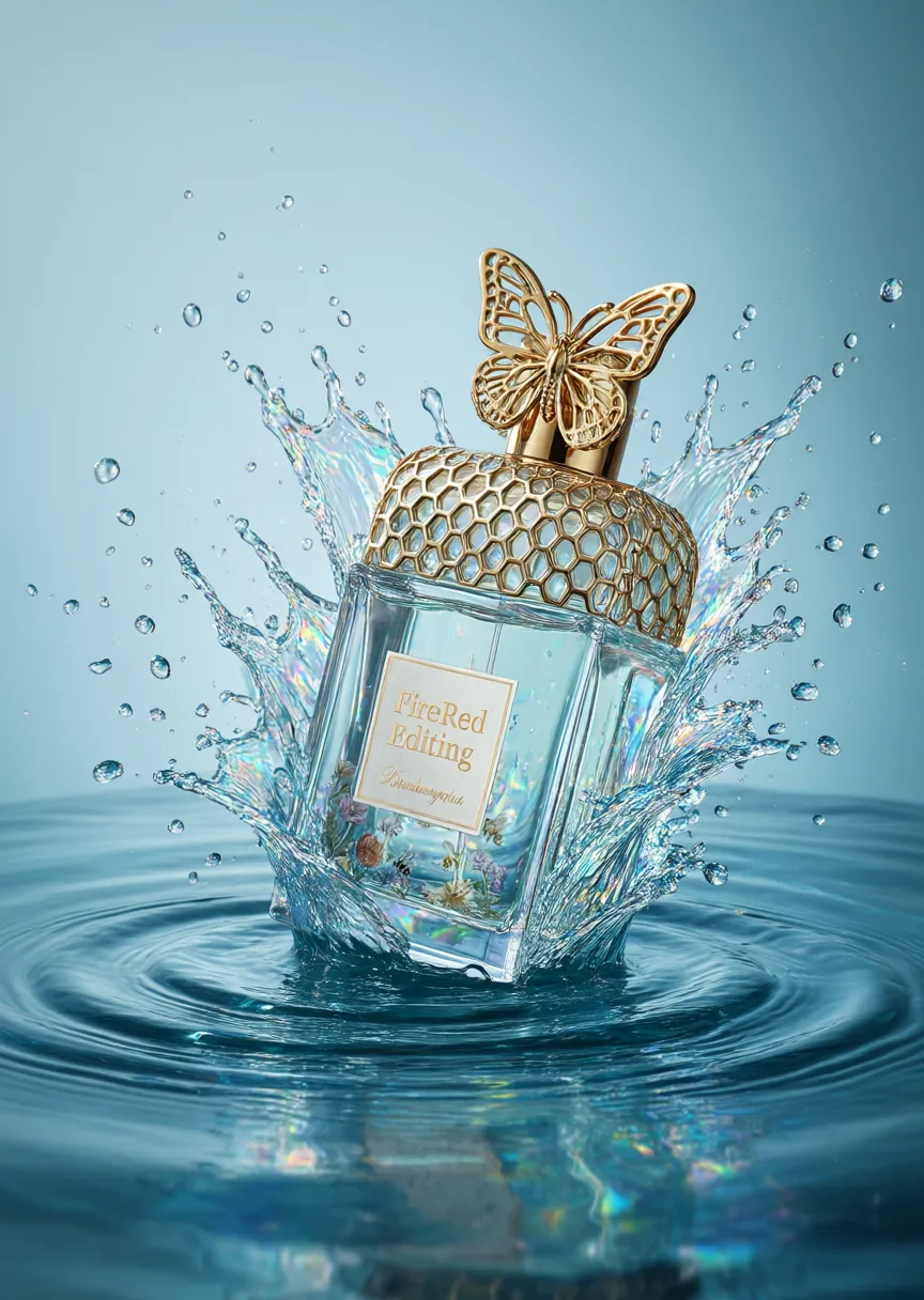 一瓶香水放居中,香水瓶放在水面上,透明方形瓶身搭配金色金属瓶盖,极简而现代。晶莹的水花如爆炸般环绕瓶身绽放开,无数水滴在空中定格,折射出梦幻的光彩。底部水波涟漪层层扩散,与飞溅的水花形成动静交织的视觉张力。清凉活力与高端奢华并存,仿佛将夏日清泉的瞬息灵动永久封存。透过瓶身能看到香水背后的说明书。