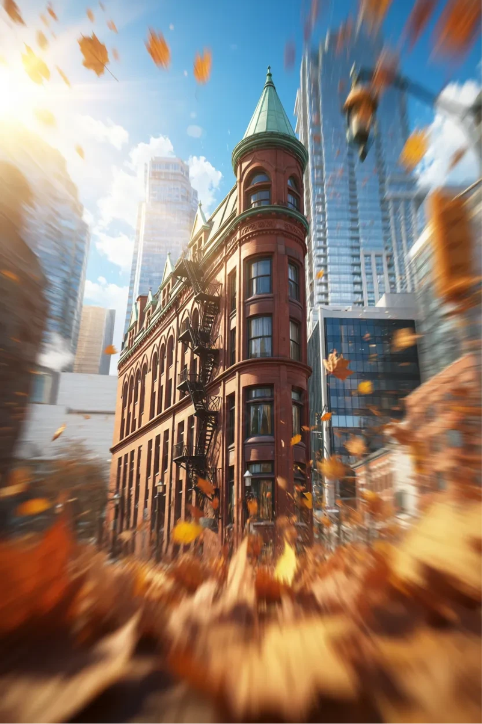 将这张图变成游戏CG风格,极具艺术感,震撼人心,超高清。落叶飞溅,前景落叶虚化,动态模糊,背景动态虚化,阳光灿烂,蓝天白云,光影交错,仰拍特写镜头,突出速度感和视觉冲击力,强透视。