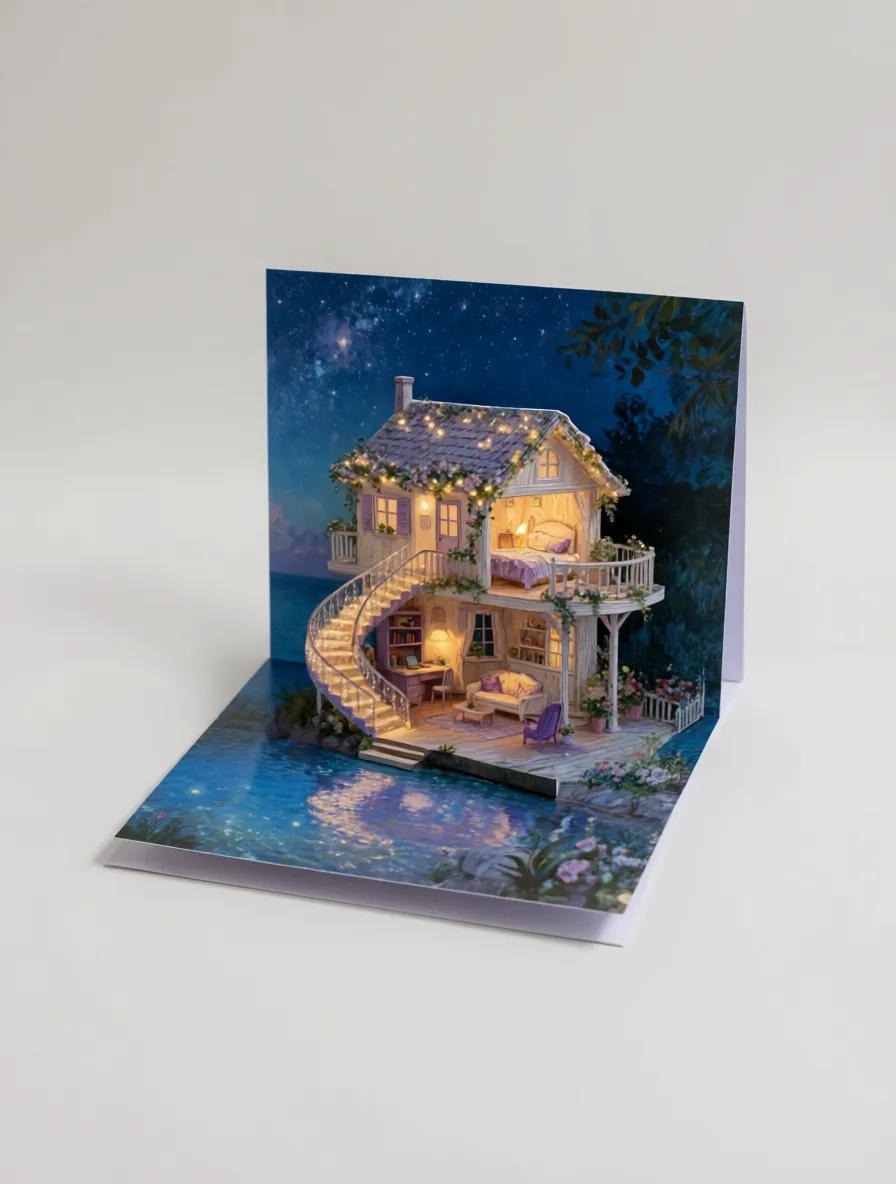 设计一张A6折叠卡:打开时显示图片中的小屋。