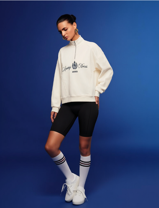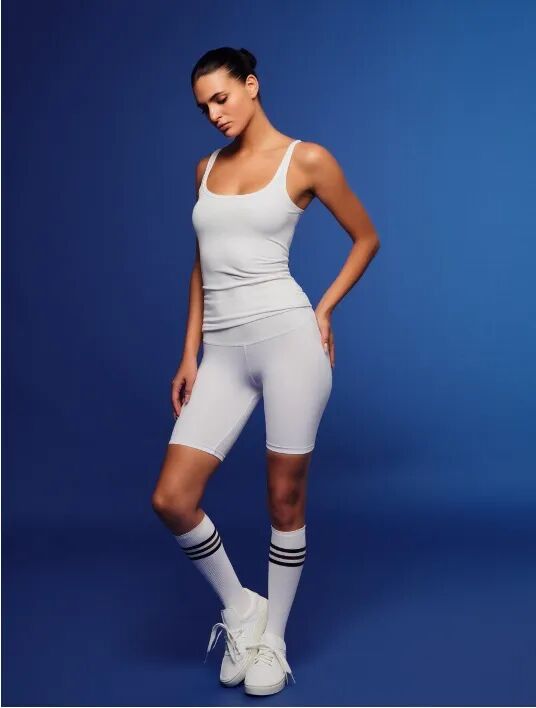 模特穿上图1服饰,版型宽松。搭配黑色、材质为氨纶、纯色、紧身、长度至大腿中部的骑行短裤,再搭配金色圆环耳环。