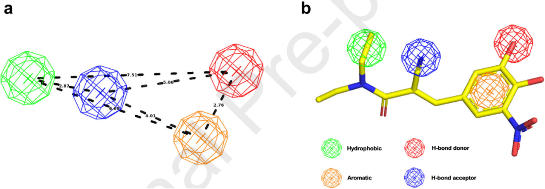 图3 基于药效团虚拟筛选中的关键表示方式。a)药效团距离映射;b)三维药效团比对。