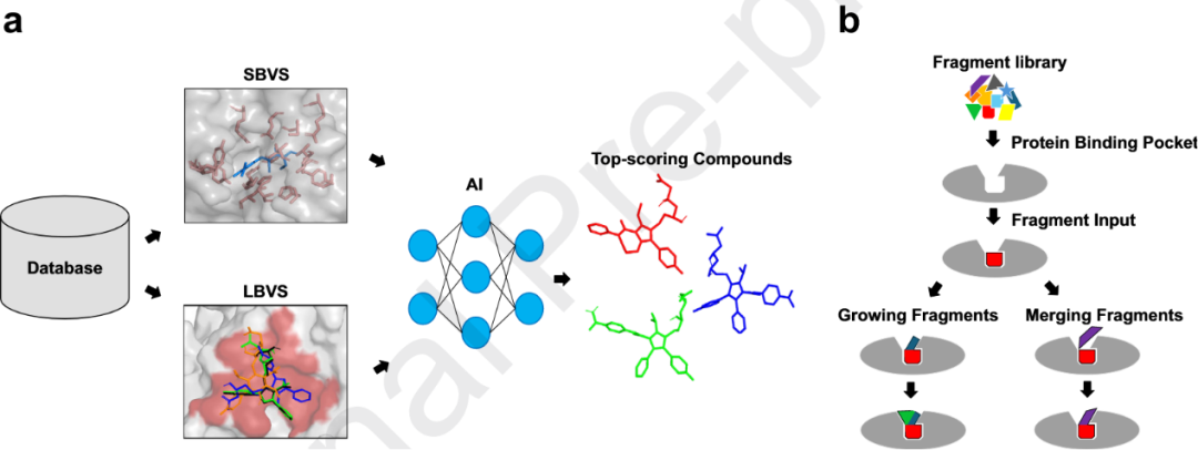 混合型虚拟筛选方法通过整合SBVS、LBVS、基于片段的方法以及ML/DL,以应对穷尽式ULVS在计算与实验层面的固有限制。此类工作流程并非对整个化学库进行无差别对接,而是引入中间决策层,例如相似性扩展、生成模型、药效团约束或片段锚定,以将计算资源聚焦于化学和结构上最相关的化学空间区域(图4a)。这一设计理念使得在处理超过1亿规模的化学库时,既能实现高效导航,又能保持苗头化合物质量和化学新颖性。