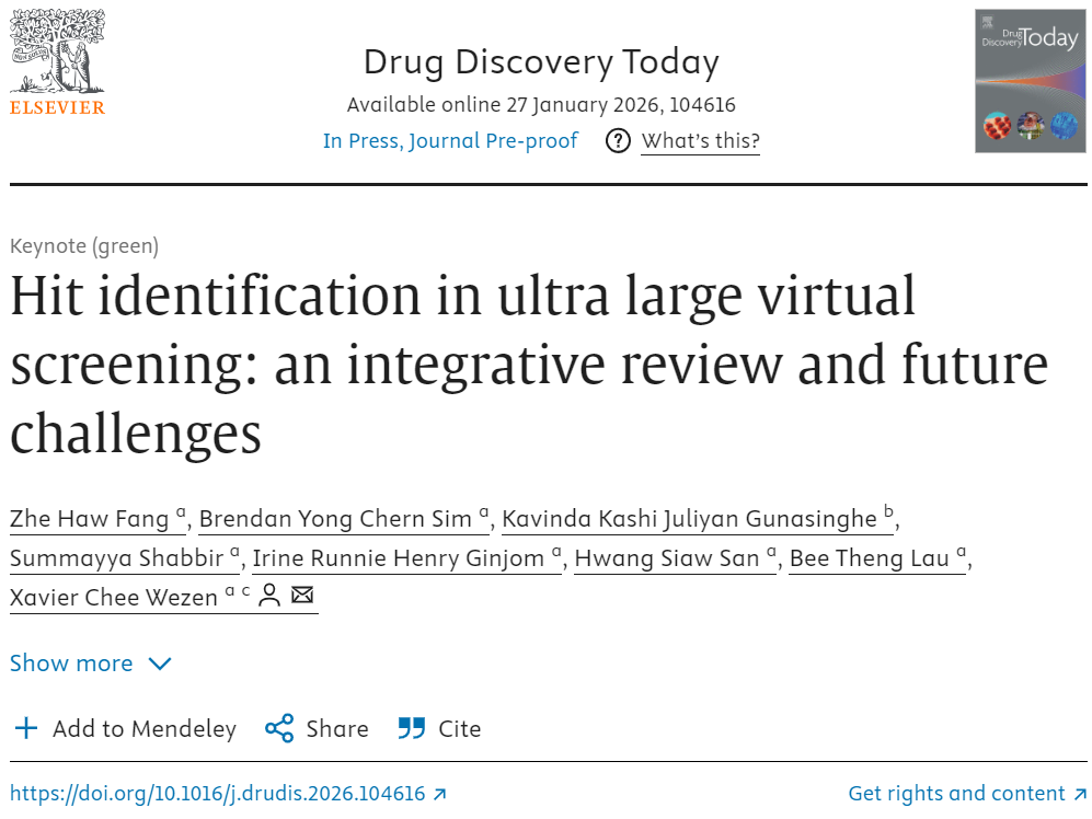 超大规模虚拟筛选(ULVS)的发展使得对数亿乃至数十亿级别化合物进行系统性评估,从中发现潜在苗头化合物成为可能。2026年1月27日,斯威本科技大学砂拉越校区与蒙纳士大学的研究人员在《Drug Discovery Today》上发表综述文章,题为“Hit identification in ultra large virtual screening: an integrative review and future challenges”,对该领域的最新进展进行了系统总结。