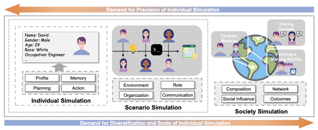 摘要:传统社会学研究通常依赖人类参与,这种方式虽然有效,但成本高昂、难以规模化,并且存在伦理方面的顾虑。近期大语言模型(LLMs)的发展凸显了其在模拟人类行为方面的潜力,能够复现个体反应,并促进众多跨学科研究。本文对这一领域进行了全面综述,阐述了由大语言模型驱动的智能体在仿真模拟研究方面的最新进展。我们将这些模拟分为三类:(1)个体模拟(Individual Simulation),用于模拟特定个体或人口统计群体;(2)场景模拟(Scenario Simulation),其中多个智能体在特定情境下协作以达成目标;(3)社会模拟(Society Simulation),通过建模智能体社会中的交互来反映现实世界动态的复杂性与多样性。这三类模拟呈现出一种递进关系,从精细的个体建模逐步扩展到大规模的社会现象。我们对每种模拟类型进行了详细讨论,包括其架构或关键组件、目标或场景的分类、评估方法以及深入讨论。随后,我们总结了该领域常用的数据集、基准和工具。最后,我们探讨了这三种模拟类型所面临的共同风险与挑战。