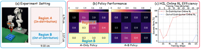 如图所示,我们在一个高精度积木插入任务上开展实验,该任务对空间位置精度要求较高。所有策略均基于 Octo 模型构建。我们将工作空间划分为分布内区域 A(由示范数据覆盖)与分布外区域 B(在 SFT 阶段未被观察到)。