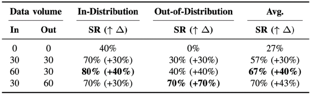 表 I:探索空间扩展的消融实验。我们在 SFT warm-up 阶段改变加入的孪生生成轨迹数量,并测量相应的成功率(SR)。