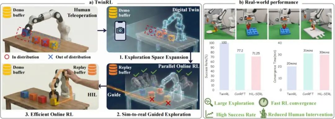 在此基础上,TwinRL 进一步提出了一种 sim-to-real 引导的探索机制,在部署前于数字孪生环境中执行高效并行的在线强化学习,从而有效衔接离线训练与真实世界在线学习过程。
