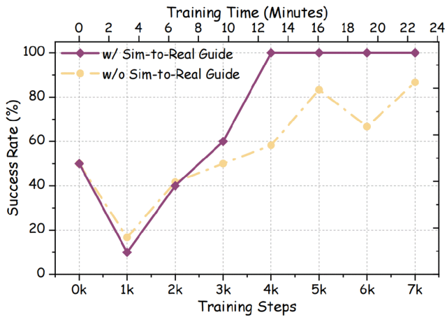 图 x:Sim-to-Real 引导 HiL 的消融实验。引导机制显著加速了强化学习过程,在约 4k 步(约 14 分钟)时达到 100% 成功率;而未使用引导机制的训练收敛更慢,且最终成功率更低。